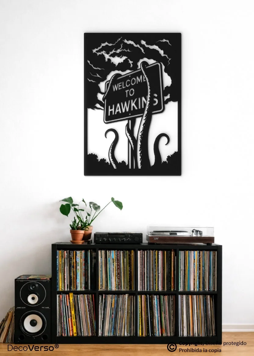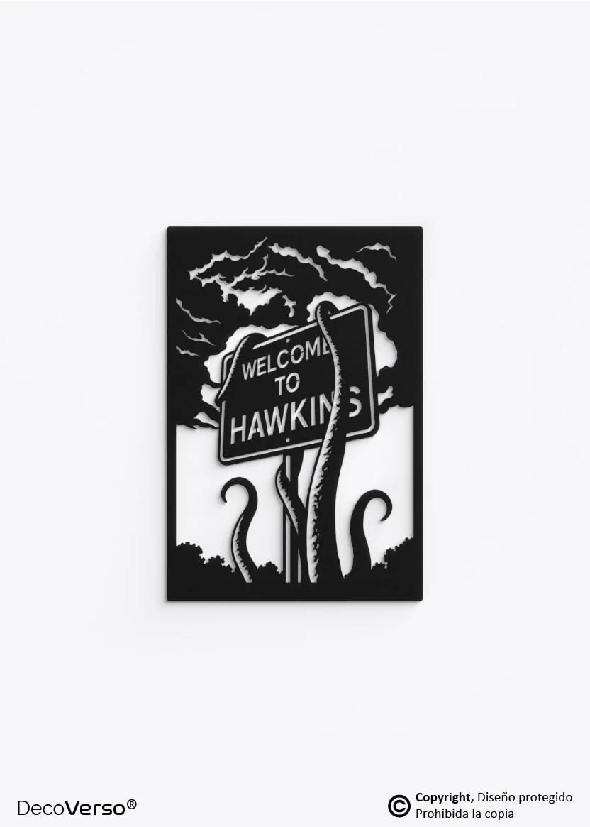 Diseño exclusivo de DecoVerso®, este cuadro metálico Bienvenidos a Hawkins es un fan art inspirado en el inquietante pueblo de Stranger Things.